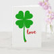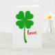 This card features a minimalist digital illustration with a lush emerald four-leaf clover placed on the left, each leaf shaped like a neat little heart. The clover’s slender stem curves gently, like it’s leaning in toward someone, adding a quiet romantic touch 💚. To the right, the word “love” appears in flowing scarlet lettering, positioned mid-height so it feels like it’s being offered back to the clover. The red and green pairing creates a soft, affectionate contrast, with the clover’s calm shape balancing the warmer red word ☘️. Behind everything is an off-white background with a subtle vertical ribbed texture that gives the simple layout a bit of depth. Near the very base of the stem, a tiny red dot repeats the red from the “love” text, like a small visual wink. The composition stays uncluttered, with generous open space around the clover and the red word on the lightly ribbed off-white field.