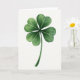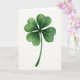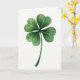 This design shows a watercolor four-leaf clover centered on a bright white background, its four heart-shaped leaves opening like a small bouquet shared between close friends 💚. Deep emerald gathers near the middle, then shifts into softer moss and spring greens along the gently wavy edges, giving the leaves a tender, cared-for look. Pale veins fan outward across each leaflet, like quiet paths that draw your eye from one leaf to the next. A slim stem curves downward in a relaxed arc, adding a graceful sense of movement to the simple scene. Near the top, a short St. Patrick’s Day greeting sits in light green lettering, spaced neatly above the clover so it feels airy rather than crowded ☘️. The text is centered and small enough to let the clover stay in the spotlight, while still being easy to read at a glance. The paint edges are slightly uneven and softly feathered, with a few translucent washes pooling near the leaf tips. A tiny hint of darker green gathers at the base where the four leaflets meet, creating a natural focal point.