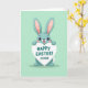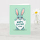 This card features a friendly long-eared rabbit character with big, expressive eyes and soft teal fur, standing centered on a pastel mint-green background 🐰. The rabbit lifts a heart-shaped sign above its head as if offering it to someone special, with a tender, eager grin and rosy cheeks that suggest a sweet crush or close friendship. The greeting text sits on the heart sign in deep teal lettering, with a couple of small affection symbols placed nearby. A soft pink tint lines the tall inner ears, framing the face and adding a gentle, affectionate look. The layout stays simple with plenty of open space, keeping the focus on the character and the message. The colors feel light and springlike 🌷, with smooth outlines and a calm, uncluttered setting. A small, minimal shadow rests directly under the rabbit’s feet on the flat mint background.