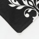 Leaf and scroll heart shaped damask surface pattern design with white detail on a black background.