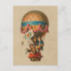 Vintage image from mid to late 1800s of two children ascending in a hot air balloon carrying a heart flag.
