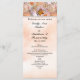Wedding program on a rack card. Beautiful design with an orange butterfly touching white heart-shaped pearl beads. Another butterfly blends into the bouquet of light orange and pink roses. Orange is the theme color on the parchment paper image. Convert this for any occasion. Add a photo and/or change the text. Personalize this template with your information.