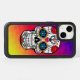 A colorful skull with a floral and heart design in colors of blue, gold, and red is the feature on this phone case. The pattern skull is placed on an abstract background of glowing blue, purple, red, and gold. Trendy and bright!