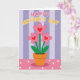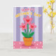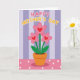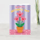 This card features a sweet graphic illustration centered on a potted plant with three pink flowers, each with a small red heart at the center ❤️. The rounded petals and slim green stems lean slightly toward one another, like close friends sharing a quiet moment. A warm orange-brown pot sits beneath the blooms, giving the scene a cozy, homey feel. Above the plant, a short message of appreciation is placed near the top, written in bubble-like letters that alternate soft pink and sunny yellow, with a thin white outline to make the words stand out. Behind everything, wide vertical stripes in soft lavender and pale lilac create a calm backdrop that keeps the focus on the flowers. Below the pot, a rosy pink surface dotted with neat white polka dots adds a light, affectionate touch 🌼. The hearts in the flower centers are a bright red, contrasting against the gentle purple-striped background and the pink polka-dotted foreground.