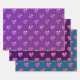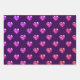Wrapping paper sheets of purple, aubergine and teal colors with a heart shaped gemstone pattern on them.