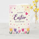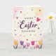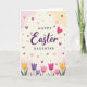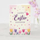 This card features a tall spring scene with a soft gradient background that shifts from creamy yellow at the top into blush pink below, setting a gentle, affectionate mood. Near the center, “HAPPY” sits above “Easter,” with “DAUGHTER” placed below, arranged like a warm note meant for someone close. “Easter” appears in deep plum, flowing lettering, while “HAPPY” and “DAUGHTER” use a simple, neat font in the same rich tone for a coordinated look. Across the upper area, small hearts in rose, fuchsia, and light lavender float among tiny dots, like quiet signals of closeness between family and friends 🌷. A larger magenta heart stands out toward the upper right, drawing attention like a sweet accent. Along the bottom, a row of tulips in yellow, purple, and pink rises from green stems and leaves, framing the message with a garden-fresh feel 🐰. The petals are rounded and stylized, and the greenery forms a low border that stretches across the lower third.