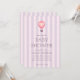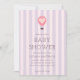 Cute baby shower invitation featuring a pastel purple striped background paired with a hand-drawn hot air balloon and an elegant serif font in which your personalized information is written in. You can find more matching products from this collection in our store.