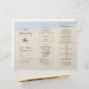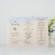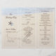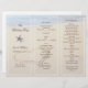 Heart in sand wedding program template. Fold in thirds to create a unique and beautiful beach theme wedding program. Easily customize using the template text lines provided. Two starfish decorated the front third which has four templates using brown text. Ocean water can be seen at the top lapping against the beach with a big heart drawn in the beach sand. This image will be printed on ONE SIDE ONLY. The reverse will be plain.