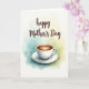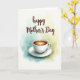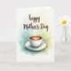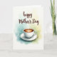 This card features a white ceramic cup on a matching saucer, filled with a dark coffee topped by creamy heart-shaped foam that feels like a quiet ❤️ shared across the table. A thin curl of steam rises from the surface, adding a cozy touch like someone just set it down for a friend or partner. Behind the cup, a soft watercolor-style background fades from translucent teal on the left to a gentle, sunny yellow on the right 🌼. Small paint splatters and loose, organic marks scatter around the scene, giving it an airy, relaxed setting without distracting from the cup. Near the top, a flowing, handwritten-style message sits centered in deep brown, standing out clearly against the pale wash. The lettering stays in the upper area while the cup and saucer anchor the middle, keeping the layout balanced and easy to read. The heart foam is neatly symmetrical, with creamy tan and off-white tones swirling into the darker coffee. The saucer shows a light gray shadow underneath, and the background wash is speckled with teal and yellow droplets.