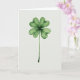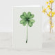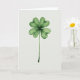 This design shows a single four-leaf clover painted in soft watercolor, centered on a wide white background that feels open and airy 💚. The slender stem rises neatly into four heart-shaped leaves that spread evenly, like they’re leaning in toward one another in a gentle, affectionate huddle. Each leaflet shifts from deeper emerald near the middle to lighter lime along the edges, giving the clover a tender, almost touchable depth. Pale highlights sit on the leaves like tiny beads of dew, suggesting early morning light and a quiet, shared moment ☘️. There’s no scenery around it, which makes the clover feel like a small token set aside for someone special. Any greeting text is kept minimal, placed below the clover in a light green tone so it doesn’t compete with the painting. The pigment softly feathers at the stem and along the slightly uneven leaf edges, with faint translucent washes pooling near the center.