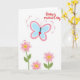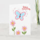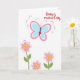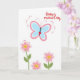 This card shows a tender scene on a bright white background, with a stylized butterfly near the top in soft sky blue wings edged with gentle pink. A small red heart sits on the butterfly’s darker body, hinting at affection ❤️, while red dashed curves around it suggest a light flutter through the open space. Along the bottom edge, three simple flowers rise up, each with pink petals and sunny yellow centers that include tiny smiling faces, like friendly little companions. Thin green stems and small leaves keep the garden feeling grounded and sweet, as if the butterfly has just drifted down to greet them. In the upper right, a short phrase appears in red lettering, placed neatly so it balances the butterfly without crowding it. The mix of pastel blues and pinks with bright red and yellow creates a gentle contrast that feels warm and close, like a shared glance between friends 🌼. The red dashed flight marks curve in small arcs around the butterfly above the three flowers.