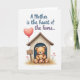This card shows two plush-like figures cuddled inside a small rustic shelter, with the larger amber-toned figure wrapping its arms around a smaller companion in a protective, affectionate pose ❤️. Their rounded shapes and soft shading give them a cozy, touchable look, like stuffed toys resting close together. The little house-like setting uses warm natural browns and simple lines, making the embrace feel tucked away and safe. Across the upper area, the message “A Mother is the heart of the home...” sits above the figures, with lettering that shifts from deep indigo into gentle lavender. Off to the left, a coral-blush heart balloon floats near the pair, held by a thin string that drops downward. Along the bottom edge, golden straw supports a few delicate sprigs dotted with tiny red heart blossoms, adding a sweet, caring note 🌼. The background stays bright white so the warm colors and tender body language stand out, and the balloon’s soft coral heart is clearly visible beside the shelter.