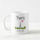 A coffee mug with a whimsical drawing of the Eiffel Tower in the background surrounded by green trees. A pink heart and Paris typography add a girlish flair. Personalize with a name,.