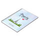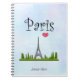A personalized notebook with a whimsical drawing of the Eiffel Tower in the background surrounded by green trees. A pink heart and Paris typography add a girlish flair.