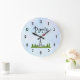 A clock with a whimsical drawing of the Eiffel Tower in the background surrounded by green trees. A pink heart and Paris typography add a girlish flair. A light blue watercolor background