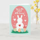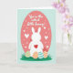 This greeting card features a soft pastel illustration on a pale blue background, centered on a white long-eared bunny seen from behind 🐰. The bunny stands in front of a large coral-pink oval filled with tiny white hearts, and a bright red heart sits on its back like a sweet secret meant for someone close. Above the bunny, the message “You’re the cutest little bunny!” is placed near the top in a flowing, cursive-style font, colored in a matching deep pink. The simple shapes and gentle shading give the scene a calm, cozy look, and the bunny’s relaxed posture suggests an affectionate bond, like it’s waiting for a hug or a friendly tap on the shoulder. Along the bottom edge, a small patch of green grass grounds the scene, adding a springtime touch 🌷. Nestled beside the grass are three decorated eggs with stripes and polka dots in mint green, peach, and light blue. The coral oval sits behind the bunny like a spotlight, sprinkled with small white hearts that echo the red heart on its back.