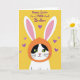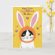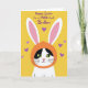 This card features a white cartoon cat with black patches around its bright yellow-green eyes, looking outward with a tender, friendly gaze. A small pink nose and fine whiskers add softness to its face, as if it’s posing for someone it cares about. The cat wears an orange hooded outfit shaped like a bunny costume 🐰, with tall white ears lined in light pink rising above its head. Behind the character is a solid golden-yellow background that keeps the focus on the sweet expression and costume details. Small lavender hearts are scattered around, suggesting affection and closeness without needing anything else. Near the top, a festive greeting is written in flowing purple lettering, centered above the character and easy to spot at a glance 🌷. The purple text sits over the yellow field, while the lavender hearts float around the cat like tiny accents. The long white ears extend upward into the open space, with pink inner shading clearly visible against the golden background.