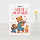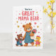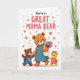 This card shows a sweet trio of bear-like characters standing close together, their hands linked in a way that suggests a caring family bond ❤️. The central adult has gentle brown fur, rosy cheeks, and a sky-blue dress with small dots, and she carries a cream tote filled with pink flowers and leafy green stems. On her left, a smaller cub wears denim-blue overalls with a bright pink pocket, leaning in as if enjoying the shared moment. On her right, another cub wears a pink dotted dress with a matching bow, smiling up with an affectionate, friendly energy 🌼. All three face forward with wide, welcoming smiles that feel like a warm hug in picture form. Across the top, large lettering sits prominently, mixing deep blue words with coral-colored words for emphasis. The background stays white and airy, sprinkled with floating hearts in rose tones and touches of sparkling gold.