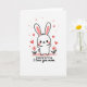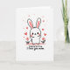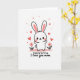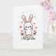 This greeting card features a stylized white rabbit-like character centered on the front, standing with open arms as if ready for a hug ❤️. Its long ears have soft pink inner panels, and its wide eyes and rosy cheeks give it a tender, affectionate look. A tiny heart sits on its forehead, reinforcing the gentle, romantic tone without needing extra words. The character stands on a wavy pale pink ground line, like a soft little hill, with two small flowers on either side that have pink petals, red centers, and thin green stems 🌼. The background stays bright white, making the pinks and reds stand out clearly. Near the top, short hand-drawn lettering appears in a dark tone, placed above the character so it reads first. Small red hearts float upward around the head and into the open space, forming a loose arc across the upper half of the design.