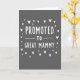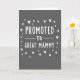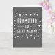 This card features a simple announcement centered on a dark charcoal-gray background, giving it a calm, modern look. In the middle, the words “PROMOTED TO GREAT MAMMY” appear in white letters with a slightly uneven, drawn-by-hand feel that adds a gentle, friendly touch ❤️. “PROMOTED” sits at the top, while “TO” is placed beneath it on a thin white line that stretches across the center like a divider. “GREAT MAMMY” is set larger below, drawing the eye downward as if the message is being lovingly revealed. Around the text, small white heart shapes are scattered in different sizes and angles, like little notes of affection floating in the air 🌼. The high contrast between the bright white text and the deep gray background keeps everything easy to read while still feeling soft and intimate. The hearts are sprinkled mostly around the sides and corners, leaving the center clear for the message to stand out.