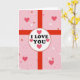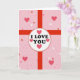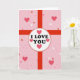 This greeting card features a soft blush pink background filled with many hearts scattered all over. The hearts come in different sizes and shades, including light outline hearts and solid hearts in pink, deep pink, and white. In the center, there’s a white circle with a red dotted border that draws your eye right away. Inside the circle, the card says “I LOVE YOU” in black, thick, easy-to-read letters. Small deep pink hearts sit near the words to add extra love and make the message feel even sweeter 💘❤️. Behind the circle, two wide red bands cross like a ribbon on a gift, giving the whole design a “wrapped with love” look. It’s a simple, sweet card that feels perfect for romance or close friendship, and it’s a nice way to share Valentine’s Day feelings 😘.
