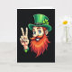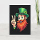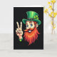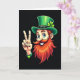 This greeting card features a cheerful leprechaun shown from the chest up against a deep black background, making his bright colors stand out right away. He wears a rich green top hat with a glowing four-leaf clover, and his orange-red beard and curled mustache frame a wide grin with white teeth. His big blue eyes shine with an inviting look, like he’s sharing a friendly secret with someone just off to the side. On the left, his raised hand forms a peace sign, and the gesture feels like a warm hello between friends. A green wristband with a small heart adds a gentle touch of affection 💚. The main greeting text sits near the top in bright green, with a smaller line near the bottom in lighter green, both easy to spot against the dark backdrop ☘️. Soft highlights along the hat brim, clover, beard, and fingers create a glowing edge that lifts the character forward from the black setting.