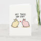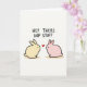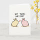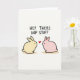 This card features two rounded bunny figures facing one another on an off-white background, their close spacing and gentle tilt suggesting a sweet, friendly connection 🐰. One bunny is pale yellow and the other is soft blush pink, both outlined with dark lines and given small dot eyes that make their expressions feel tender. A bright red heart floats between them, centered like a shared little secret. Across the top, the phrase “HEY THERE HOP STUFF” appears in uppercase, hand-drawn letters in dark ink, stretching from left to right above the pair. Beneath each bunny, a warm ochre shadow sits low and soft, giving them a grounded look without adding much depth. The simple shapes and calm colors keep the scene light and affectionate, like two friends or sweethearts pausing for a quiet moment 🌷. The heart hovers midway between their faces, with the text sitting above and the shadows resting directly under their rounded bodies.