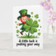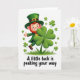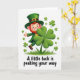 This card shows a cheerful leprechaun peeking from behind an oversized emerald four-leaf clover, set against a bright white background that makes the greens feel extra fresh 💚. He wears a green top hat with a gold buckle and a tiny shamrock, plus a green suit over a sunny yellow shirt, and his brown boots shine with gold accents. His auburn beard, rosy cheeks, and wide grin pair with twinkling eyes, like he’s sharing a friendly, flirty secret with whoever’s looking. One arm reaches outward while one knee lifts mid-step, giving the pose a light, dancing energy ☘️. Around him, small heart-shaped shamrocks float across the open space, adding gentle motion and a sweet, affectionate touch. Near the bottom, the message “A little luck is peeking your way” sits in green lettering, centered beneath the clover for an easy-to-spot greeting. A soft strip of shaded green grass rests at the base of the giant clover, grounding the scene.