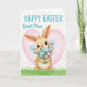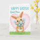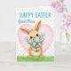 This card features an upright bunny 🐰 centered in front of a large textured heart in soft pastel pink, creating a cozy backdrop that feels like a gentle hug. The bunny is golden-brown with rosy cheeks, wide dark eyes, and a small smile that reads like a shy, affectionate glance. Its tall ears stand alert with pale pink interiors, adding to the sweet, attentive look. In its paws, it holds a spring bouquet of tiny sky-blue flowers and candy-pink heart-shaped blooms, tucked among fresh green leaves 🌷. Along the bottom edge, a strip of green grass adds a grounded base, as if the bunny has stepped forward to offer the flowers to someone special. The background stays off-white with faint rounded tan dots scattered lightly, keeping the scene airy and soft. Near the top, bright blue text is placed overhead, standing out clearly against the pale background. The bouquet’s pink hearts and blue blossoms sit just above the grass, angled slightly toward the bunny’s smile.