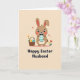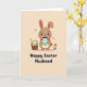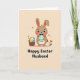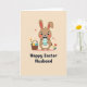 This card features an upright cartoon rabbit in soft brown tones, with large ears that show bright pink on the inside 🐰. Its wide eyes and rosy cheeks give it a tender, friendly look, and a small black bow tie adds a neat touch. The rabbit gently holds a pale blue egg decorated with white patterns and horizontal stripes, like a thoughtful gift meant for someone special. To the left sits a rustic woven basket filled with more eggs, including a sunny yellow one and a blue striped one, beside a small orange flower with green leaves 🌷. The background is a creamy pale peach with soft lighting, and tiny red and white hearts drift around the rabbit as if echoing a quiet affection. Along the bottom, a dark, thick-lined seasonal greeting is centered and easy to read against the light backdrop. The pale blue egg has crisp white detailing, and a few hearts hover near the rabbit’s ears.