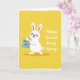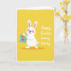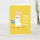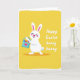 This card shows a stylized white rabbit on the left, eyes gently closed with rosy cheeks and a wide smile that suggests it’s sharing a private, affectionate moment 🐰. Its long ears have pink inner details, and the simple rounded shapes keep the character friendly and easy to read. The rabbit hugs a small light-blue basket close to its chest, as if holding a gift meant for someone special. A pink heart sits on the front of the basket, reinforcing that tender, caring tone. Inside are patterned oval eggs in red, blue, yellow, and purple, arranged like a cheerful little collection. The background is warm yellow with a lightly worn white edging that frames the scene like a soft border. On the right side, a short seasonal greeting appears in white lettering, set against the yellow so it stands out clearly 🌷. The white text sits to the right of the rabbit, balanced with the basket and eggs on the left.