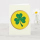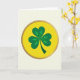 Designed with a centered three-leaf shamrock, the card shows three heart-shaped leaves in emerald and lime green that meet at a neat point, like a quiet nod between close friends 💚. A slim, curved stem drops from the middle, giving the clover a gentle, graceful posture. The shamrock sits inside a bright yellow circle that feels like a little spotlight around it ☘️. Around that circle is a narrow gold ring that catches the eye without taking over. Tiny white dots run evenly all the way around the ring, adding a soft, decorative rhythm. There’s no text on the front, so the image stays front and center against a creamy off-white background. The yellow disc is smooth and sunlit, the gold edge is thin and shiny, and the white dots are small and evenly spaced.