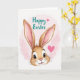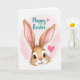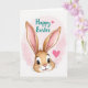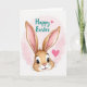 This card shows a sweet bunny face centered on a pale pink, watercolor-like background, with long upright ears that lean slightly as if listening closely 🐰. Its fur is shaded in caramel and golden brown with soft texture marks that make it look cuddly and close. The inner ears are a gentle blush pink, adding a tender touch that pairs nicely with the bunny’s wide, friendly eyes and small pink nose. A tiny, slightly open smile and fine dark lashes give it a bashful, affectionate look, like it’s sharing a quiet moment with someone special. Thin whiskers fan out from the muzzle, keeping the expression light and inviting. In the upper left, a teal greeting is written in flowing lettering, and a small pink heart sits right beside the words 🌷. A larger pink heart floats near the bunny’s right ear, standing out against the soft pink backdrop.