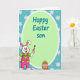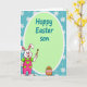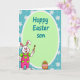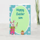 This card features a bright spring scene on a smooth sky-blue background with small white flower shapes scattered like soft confetti 🌷. Near the center, a pale yellow-green oval frames a short holiday greeting, set in dark lettering that stands out clearly against the light shape. In the lower left, a friendly cartoon bunny with white fur and a wide smile leans in as if sharing a private joke with the viewer 🐰. The bunny wears pink overalls with two green heart-shaped pockets over a deep green shirt, adding a sweet, affectionate touch to the outfit. One paw holds a tiny paintbrush, angled upward as though it just finished adding a loving detail to the scene. On the lower right, a single decorated egg balances the composition, covered in stripes, dots, and scalloped bands in pink, yellow, orange, and green. The egg’s patterned surface sits against the blue field, with the white floral motifs floating lightly behind it.