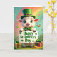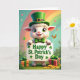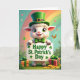 Designed with an adorable anthropomorphic lamb front and center, this St. Patrick’s Day scene leans into friendship with its gentle smile and bright emerald eyes that seem to meet yours. The lamb wears a green top hat with a gold buckle and a green plaid bow tie, standing on a grassy patch sprinkled with shamrocks ☘️. In its hooves, it holds a white sign in the middle of the card that reads “Happy St. Patrick’s Day” in green lettering, with extra shamrocks clustered around the sign. Behind it, a soft pastel rainbow 🌈 arches across a misty background, while small pink and orange hearts float nearby like little notes drifting through the air. At the bottom, the green grass is dotted with more shamrocks, two wrapped gifts in orange and pink with green ribbons, and a small pile of shiny gold coins. A single bright orange butterfly hovers near the foreground, adding a light touch of motion against the green and pastel backdrop. The rainbow fades softly into the hazy sky while the shamrocks repeat across the grass and around the sign.