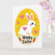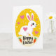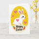 This card features a sweet white bunny inside a classic oval frame, with big black eyes and soft pink cheeks that give it a tender, friendly look 🐰. Long ears with rosy inner details tilt upward, and a small fluffy tail peeks out as if the bunny just turned to greet you. A pink heart sits on its body, adding a gentle, affectionate touch that feels like a quiet hug between friends. Behind the bunny, a sunny yellow background is sprinkled with white dots and tiny pink hearts, like confetti drifting through spring air 🌷. The lower curve of the oval shifts into a creamy tone that grounds the design and keeps the scene soft. Along this lower area, a seasonal greeting appears in rounded lettering, set in a darker ink for contrast and placed centrally. On either side of the words, two orange carrots with leafy green tops angle inward, framing the message neatly against the pale base.
