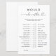 Enjoy your bridal shower with this "Would She Rather" game, featuring elegant heart script and editable text. Easily add your own details by clicking on the "personalize" option.