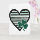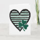 This card features a large heart outlined in rough black brushstrokes, with uneven horizontal stripes inside that alternate between textured black and muted mint green 💚. The slightly irregular lines give the heart a cozy, lived-in look, like a note shared between close friends or sweethearts. In the lower right corner, a three-leaf shamrock sits partly over the striped heart, painted in deep emerald green with visible brush marks ☘️. A thin white border surrounds the shamrock, separating it from the darker stripes and making its shape stand out. The background stays bright white, keeping the focus on the heart and clover and leaving plenty of open space around them. There’s no text on the front, so the artwork carries the message through color, texture, and placement. The heart’s black-and-mint bands run straight across, while the shamrock tilts slightly upward at the edge of the heart.