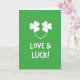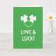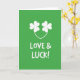 This card features a rich emerald-green background that feels like an open spring field, setting a lucky, romantic tone right away 💚. Near the top, two white shamrocks face each other and meet in a way that forms the rounded top of a heart, as if they’re leaning in close. Their smooth, organic shapes keep the scene simple while still suggesting affection and togetherness. Centered below the shamrock-heart, the words “LOVE & LUCK!” appear in bright white, standing out clearly against the green. The lettering is all caps in a friendly sans-serif style with slight natural unevenness, giving it an easy, human touch. The spacing is open and balanced, so the message sits comfortably under the symbol without crowding it ☘️. The overall look stays minimal with strong contrast, featuring two white shamrocks forming a heart above “LOVE & LUCK!” in white on a solid green field.