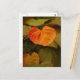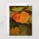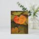 Postcard with photo of heart shaped red and orange autumn leaf of cercis canadensis Forest Pansy