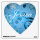 Heart shaped decal with blue flowers and swirls, with white custom name, for kids walls or bedroom door.
