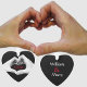A couples' hands meet and form a heart on this Christmas ornament in bold black and white with red year to be personalized for first Christmas or current year. The hands are sketched against a black background. On the reverse side, again in red, are your personalized Names of the couple. A romantic loving gift to give.