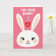 This card features a simple digital illustration of a cute, stylized rabbit centered on a bright fuchsia background 🐰. The bunny’s rounded face, wide eyes with long lashes, and small rosy cheeks give it a tender, affectionate look, like it’s gazing at someone it adores. Two long ears rise upward and frame the top area, guiding your eye to the message above. Near the top, the phrase “THE SOME BUNNY.” appears in white, all-caps letters, spaced neatly across the pink field. Just below that sits a crimson heart, carrying the words “LOVES YOU” in white, all-caps text, with a thin line connecting the top phrase down toward the heart. The limited palette of fuchsia, white, and red keeps the focus on the sweet connection between the bunny’s gentle expression and the loving words 🌷. The heart is centered above the bunny’s head, standing out sharply against the pink background.
