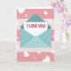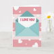 This greeting card shows an open muted teal envelope holding a crisp white card that feels like it’s just been pulled out to share ❤️. The card sits at a slight angle, drawing your eye to the big message “I LOVE YOU” centered on the front in strong crimson letters. The folded flaps of the envelope form neat geometric shapes, adding depth like a little invitation waiting to be opened 🥰. Behind it all, the setting is a field of alternating stripes in soft rose pink and pale blush, warm and gentle. White hearts in several sizes drift across the stripes, like light confetti floating around the message. The cool teal against the warm pink background creates a cozy contrast that reads as affectionate without needing extra details. The white card stands out sharply against the envelope, while the red text pops right in the middle as the focal point. Small white hearts appear scattered near the corners and along the striped backdrop, framing the envelope and card.
