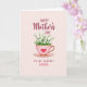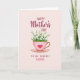 This greeting card features a soft blush-pink background that sets a gentle, affectionate mood ❤️. At the center sits a pale pink teacup on a matching saucer, decorated with a small red heart that feels like a quiet wink of romance or close friendship. Thin golden lines trace the cup’s rim and handle, adding a light touch of elegance without overpowering the scene. From the cup, a bouquet of tiny white, bell-shaped flowers spills upward, their green stems and leaves curling together as if they’re leaning in for a tender moment. Near the top, a short greeting appears in flowing, decorative lettering in a deeper pink tone, floating above the blossoms. Beneath the cup and flowers, a second line of text sits lower on the design in a simpler matching style, colored to coordinate with the pink palette 🌼. The cup’s red heart stands out against the pastel ceramic, while the white petals cluster densely above the saucer.