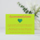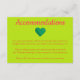 Customize this "Heart themed" hotel wedding accommodations enclosure card. Featuring a green background with pink text this card states "Accommodations" at the top in "Cookie" pink font. Underneath is a green heart. Right under the heart is your personal text inserted into a template. Easy to personalize check out the whole collection for matching products. Personalize yours today!