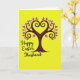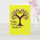 Designed with a bright spring look, this card features a stylized tree filling the upper half, with a deep aubergine trunk rising into curling branches that meet in a heart shape 🐇. The branches are dotted with almond-shaped leaves and tiny specks in rich royal purple, set against an intense neon-yellow background that feels like warm sunlight. The heart-shaped canopy suggests a close bond, like a couple leaning toward each other in a quiet, affectionate moment. Near the bottom, a flowing black message reads “Happy Easter, Husband,” centered beneath the tree to anchor the layout. The lettering stands out sharply on the yellow field, with the dark ink echoing the tree’s trunk for a tied-together look. Small purple details are scattered around the branches like confetti, adding gentle motion and a touch of springtime 🌷. The branch tips curl into spirals, and the purple leaves cluster most densely around the heart shape.