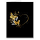 Gold heart shaped frame, decorated with gold, jewelry and white butterflies on black background.