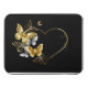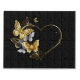 Gold heart shaped frame, decorated with gold, jewelry and white butterflies on black background.