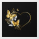 Gold heart shaped frame, decorated with gold, jewelry and white butterflies on black background.